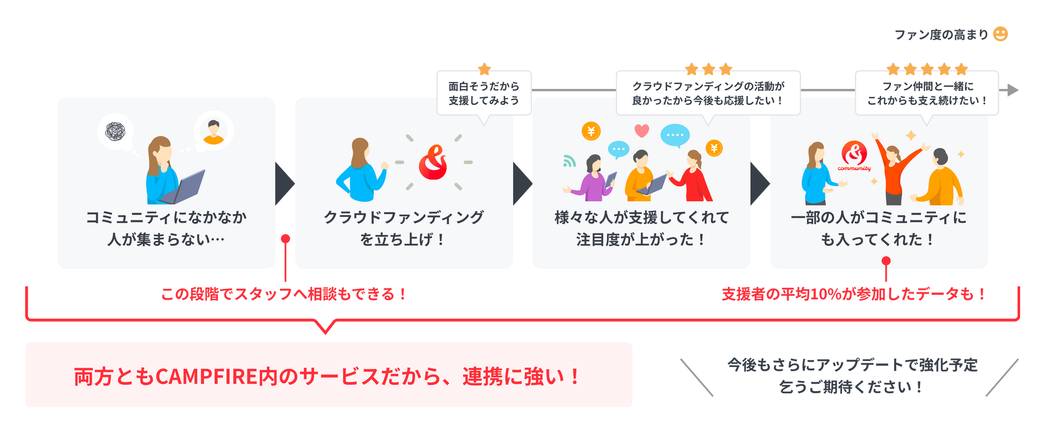 クラウドファンディングとコミュニティをうまく使いこなすことで、コミュニティを活性化しながら同時に集客を行うことができるためです。
