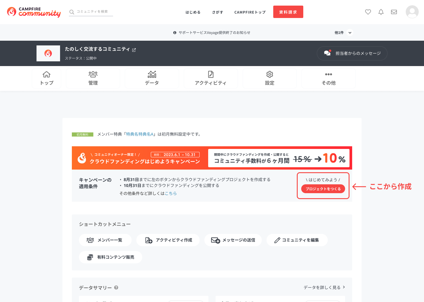 コミュニティのダッシュボードからクラウドファンディングを作成し実施することで、手数料が5%割引になるキャンペーンです。