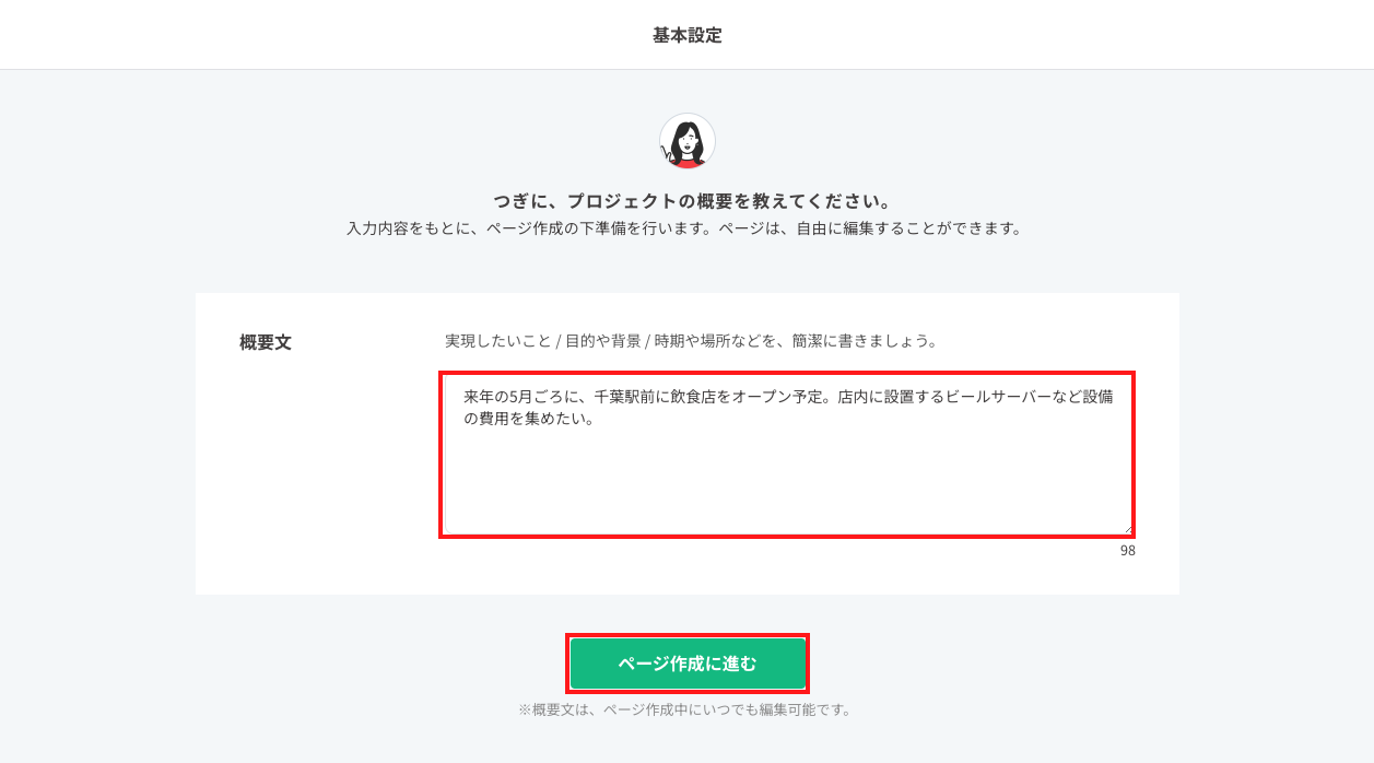 次に、今回のプロジェクト概要文を入力して頂き、「ページ作成に進む」をクリック。