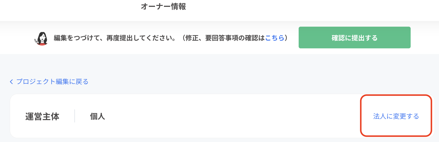 プロジェクト編集>オーナー情報を設定する>運営主体の「法人に変更する」を選択されると法人情報が表示され、情報が入力できます。