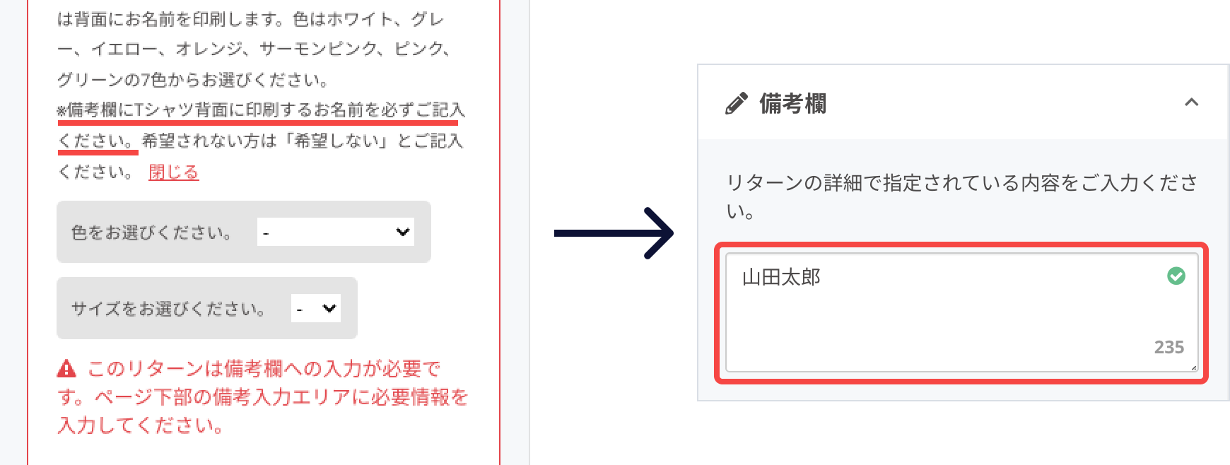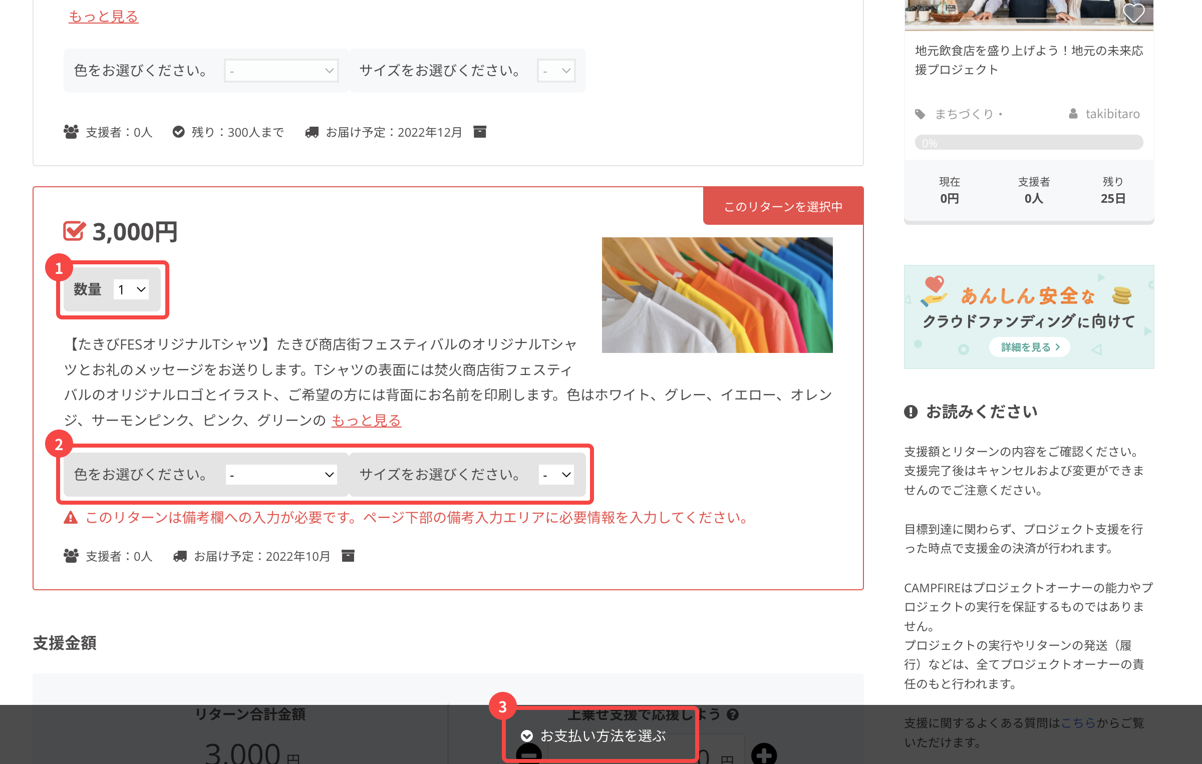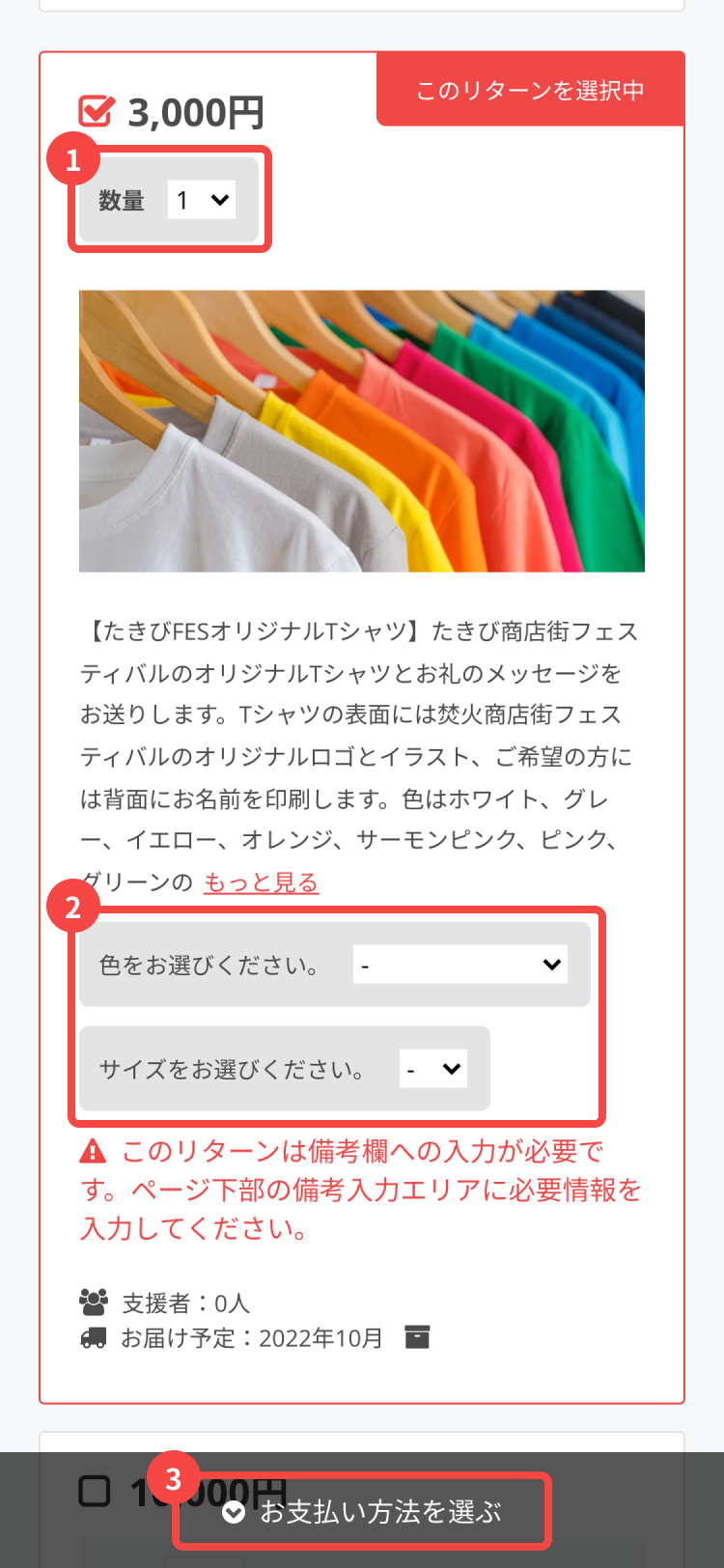 ※ 「このリターンは備考欄への入力が必要です。」と赤字で書かれている場合は、リターンの説明文を読んで備考欄へ記入する内容を確認し、画面下にある備考欄に必要情報を入力してください。