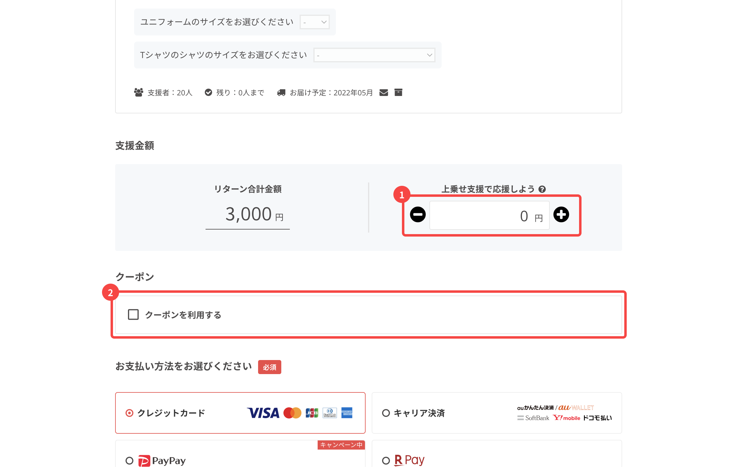 3. リターンの合計金額を確認し、必要な場合は上乗せ支援やクーポンを設定してください。
