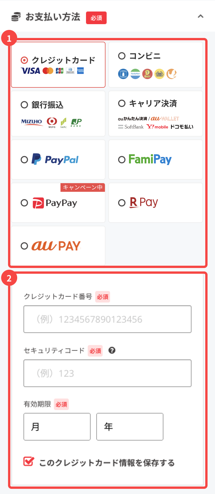「クレジットカード」を選択された場合は、カード情報を記入してください。