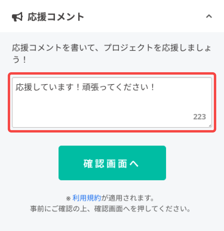 ※ 応援コメントはプロジェクトページに表示されます。たくさんの方にプロジェクトの魅力を伝えるために、是非ご入力ください。