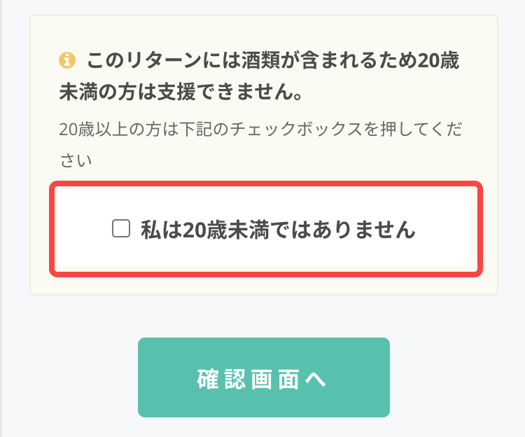9. 選択したリターンに酒類が含まれる場合は、年齢確認が表示されます。20歳以上の方はチェックを入れてください。