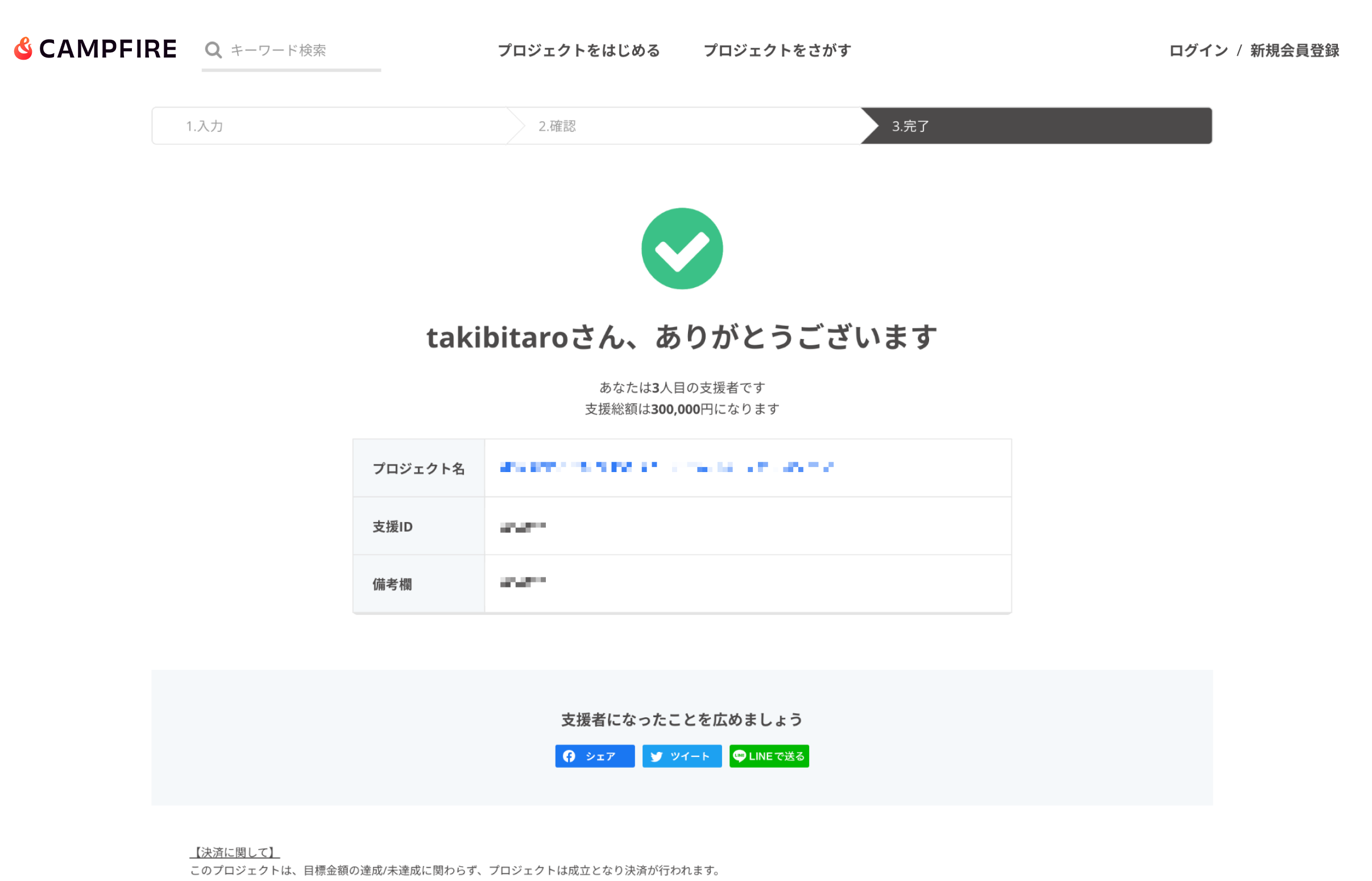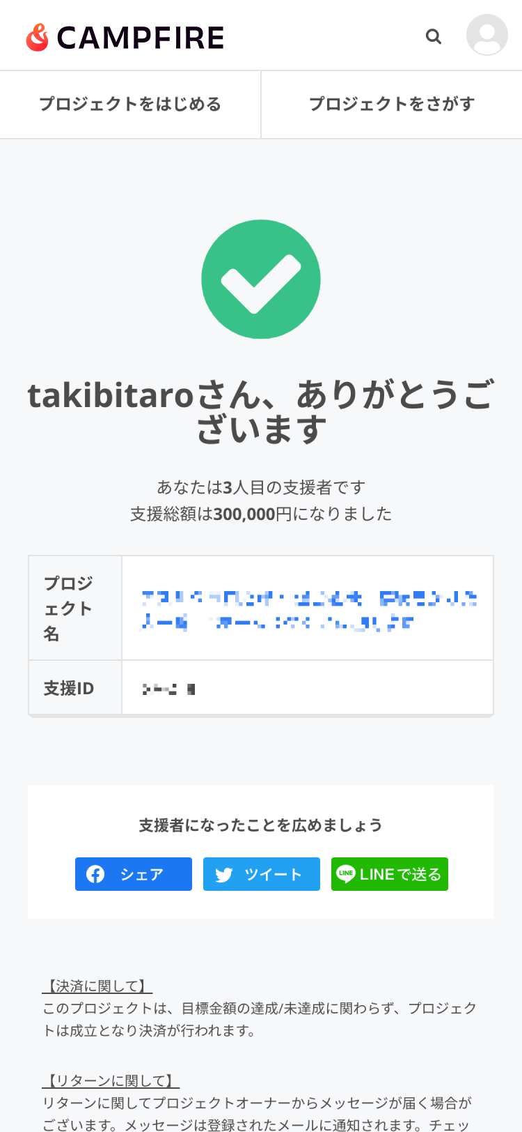 - 「支援したプロジェクト」の画面にプロジェクトが表示されていることをご確認ください。