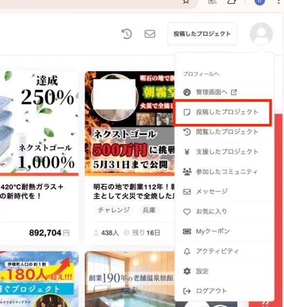②次に「投稿したプロジェクト」という項目を押下ください。