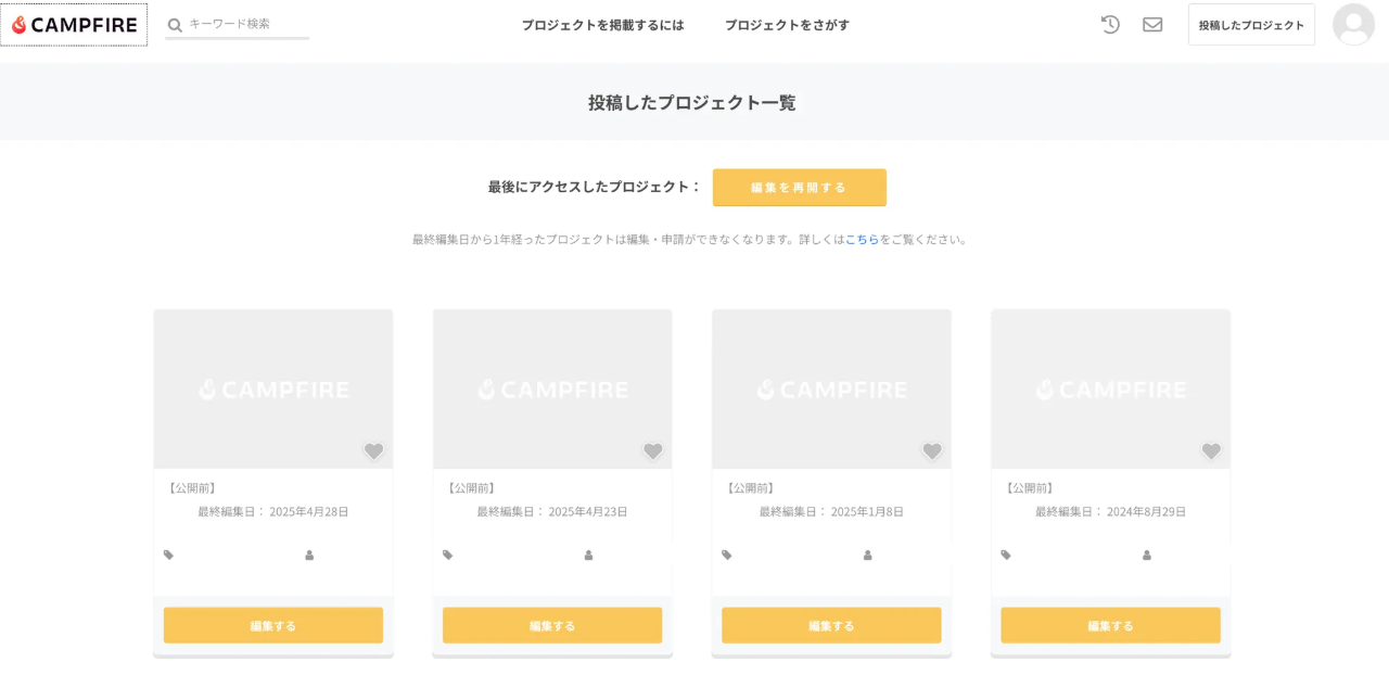 ③今までに作成された「投稿したプロジェクト一覧」を確認いただけますので、お好きなプロジェクトページの編集を再開いただけます。