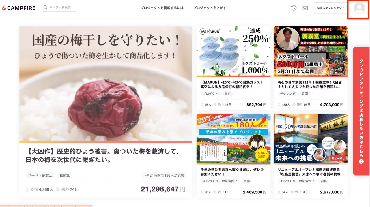 ①弊社サイトにログイン後、画面右上にご自身で設定いただいたアイコンマークがございますので、そちらを押下ください。