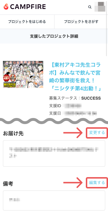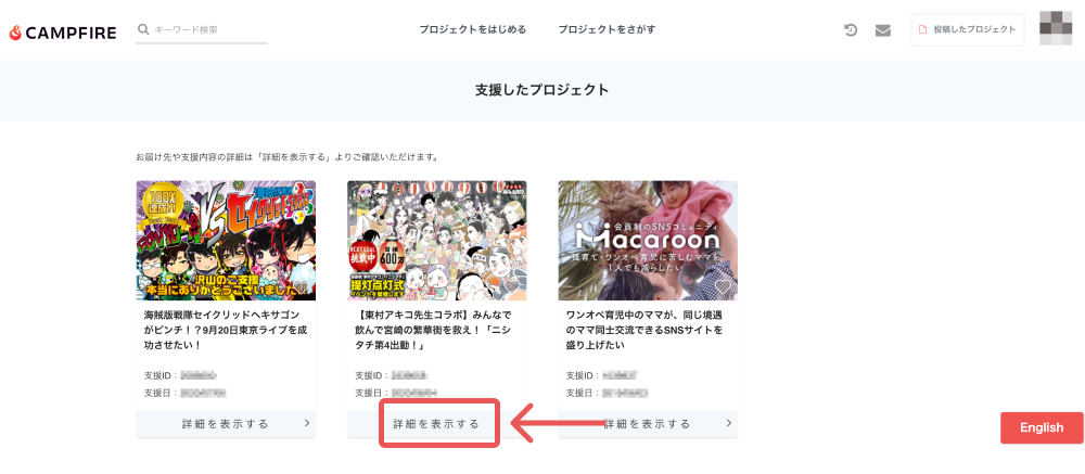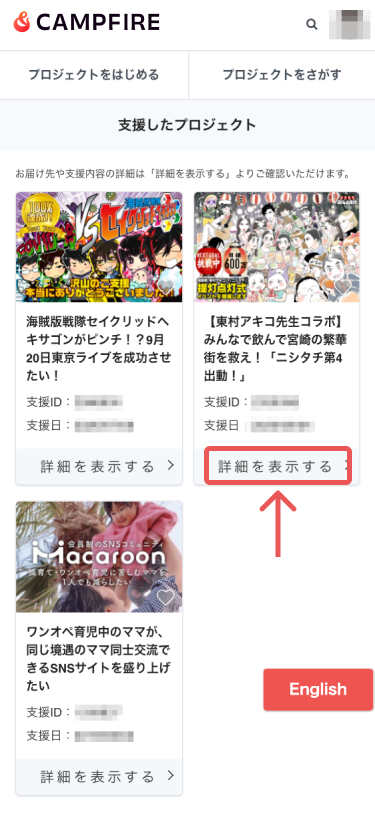 → https://camp-fire.jp/mypage/backers - 【詳細を表示する】を選択