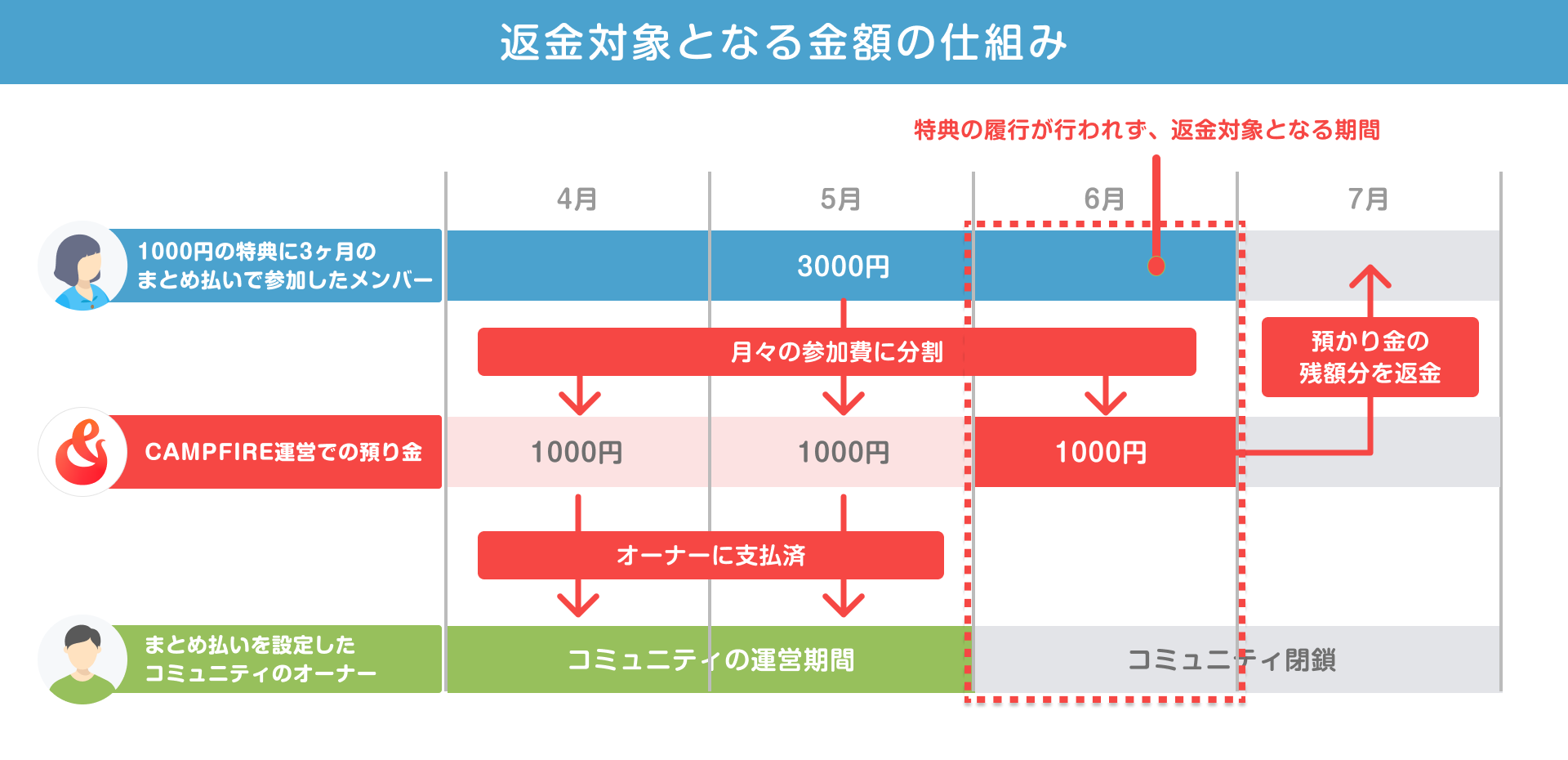 - 2ヶ月目終了後にコミュニティが閉鎖し、返金が確定した場合:
