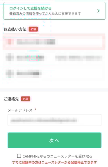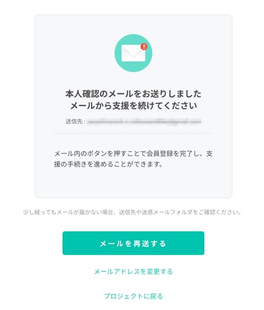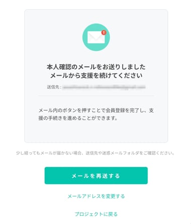 プロジェクトをご支援いただく際に「メールアドレス入力」にて