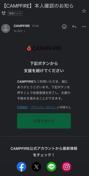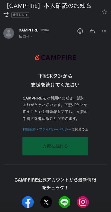 ⑧折り返し届く「本人確認のお知らせ」メール内にある「支援を続ける」を選択