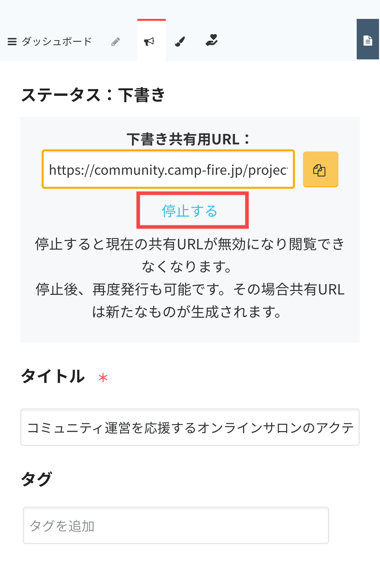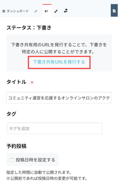 下書きを保存後、[下書き共有URLを発行する]をクリックし、URLを発行してください。