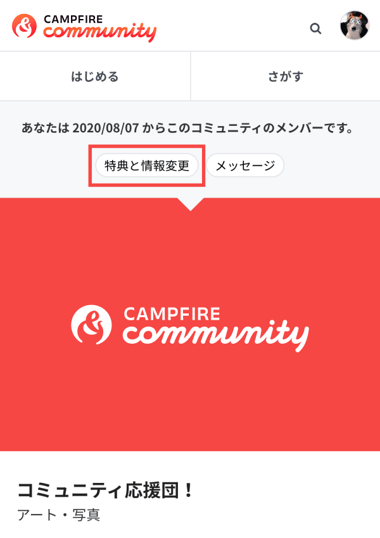 - 該当のコミュニティページの上部にある[特典と情報変更]を押します。