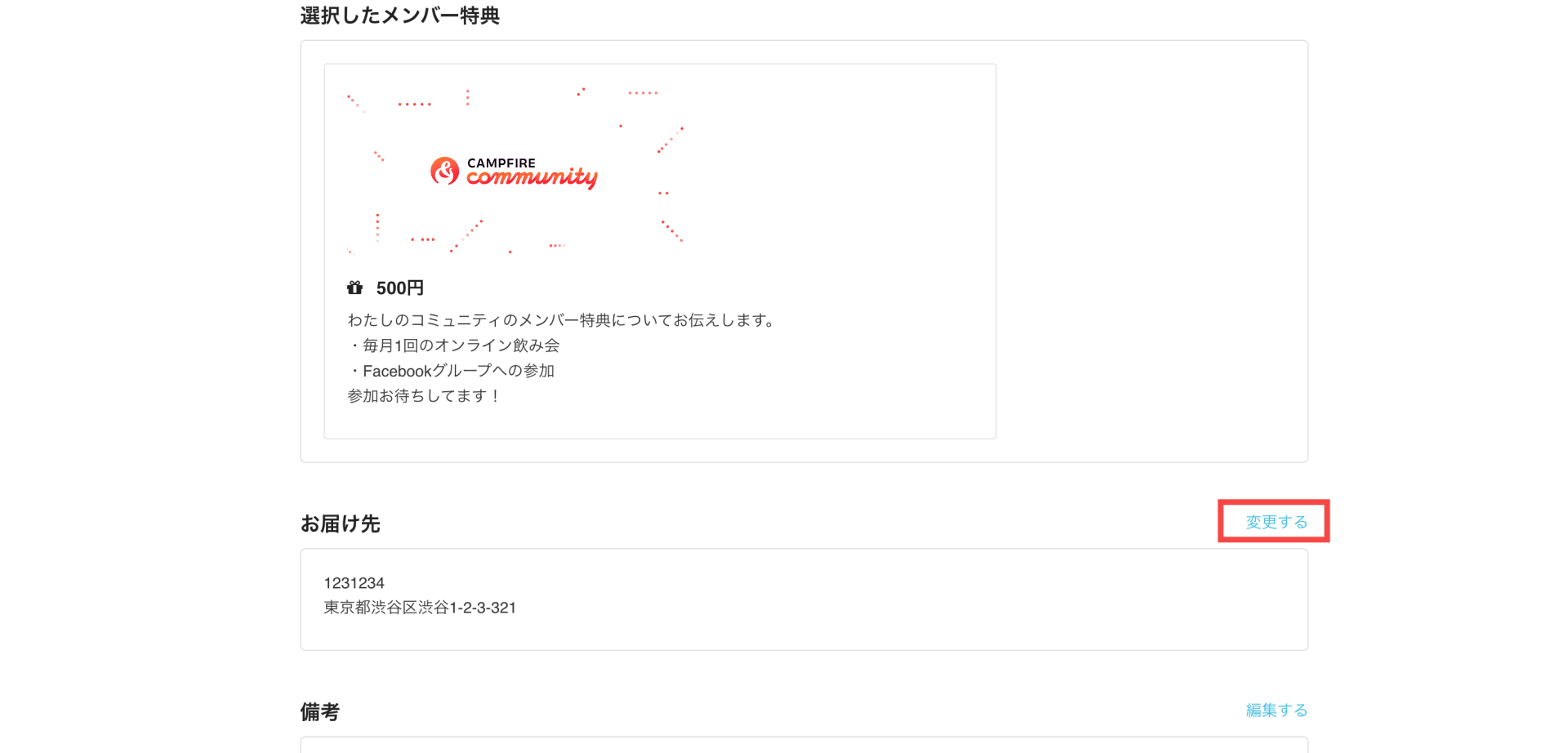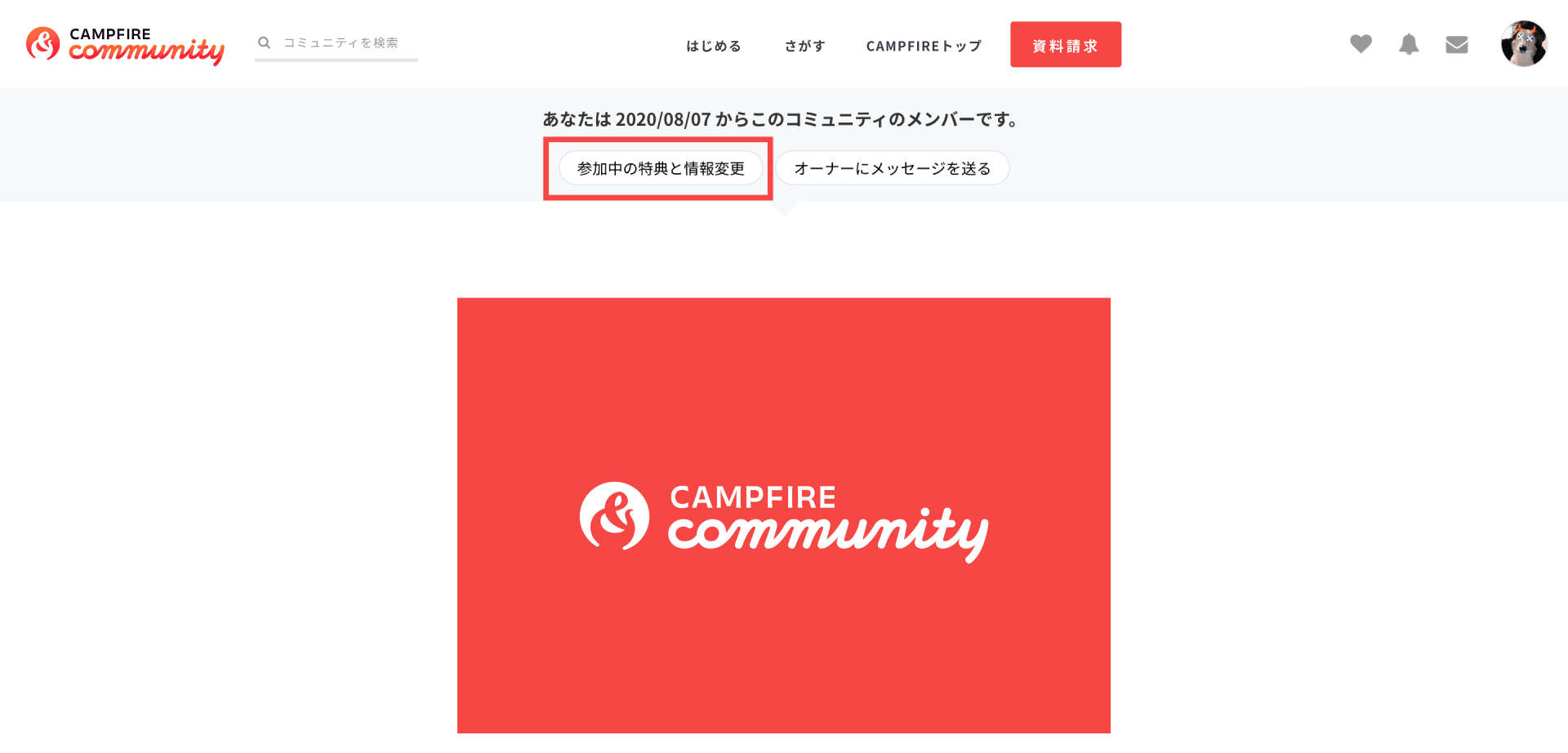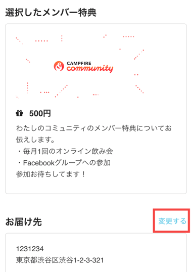 - CAMPFIREにログインした上で参加中のコミュニティページを開き、お届け先を変更したいコミュニティを選択します。