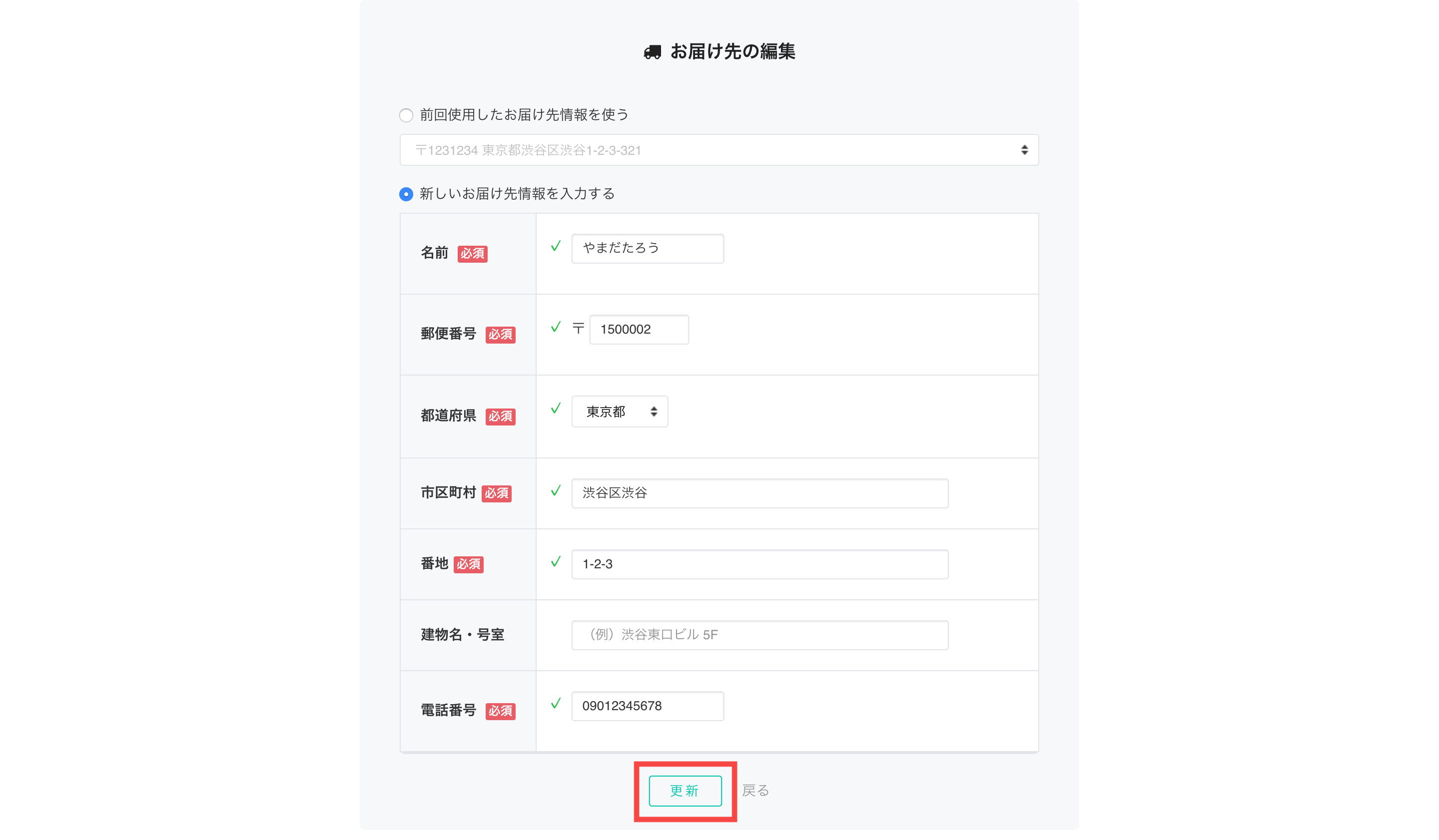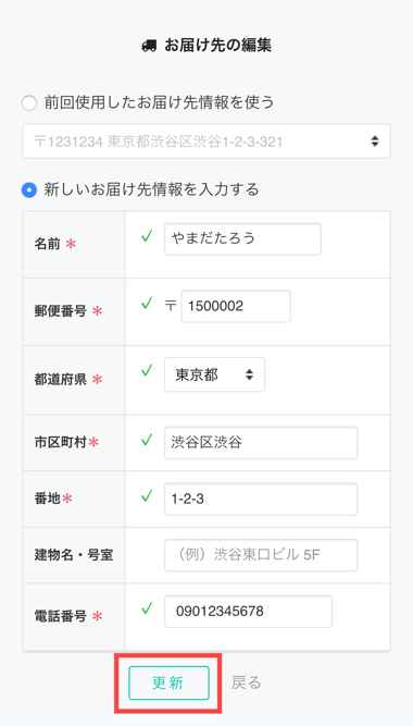 - 「新しいお届け先情報を入力する」を選択し、ご希望の住所を入力し、[更新]を押してください。