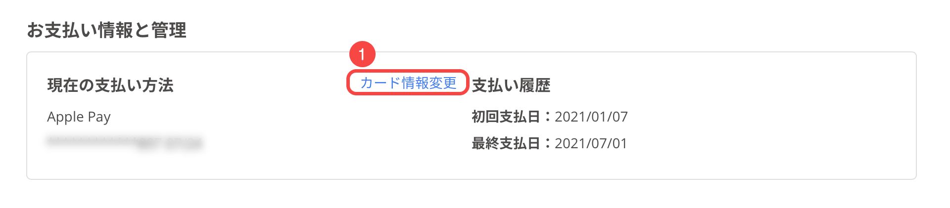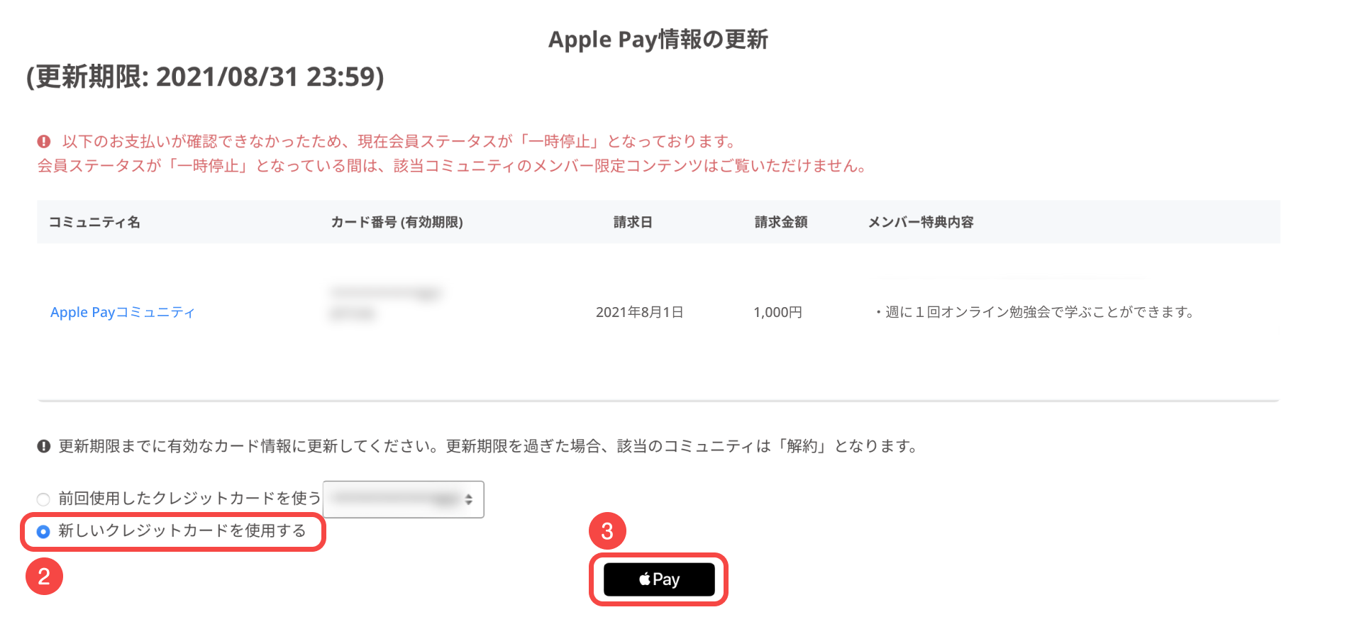 1. 参加したコミュニティ詳細ページの、お支払い情報と管理の中の[カード情報の変更]リンクからApple Payの情報更新ページを開きます。