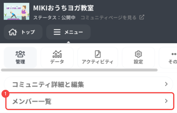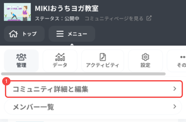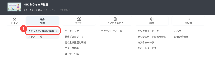ダッシュボード上部のナビゲーションバーの「管理」から[コミュニティ詳細と編集]を開きます。