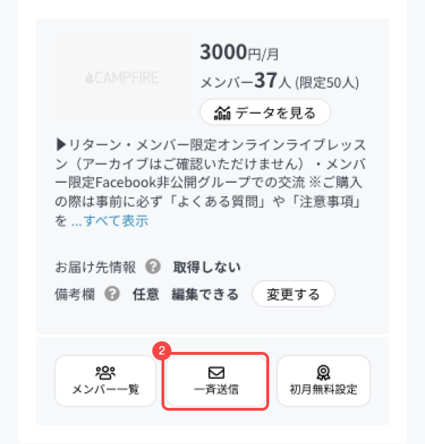 - メンバー特典の欄にある[メッセージ一斉送信]を押してください。