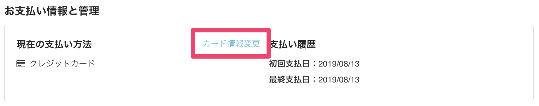 詳細ページが開きますので、お支払い情報と管理の中の[カード情報変更]リンクを押してください。