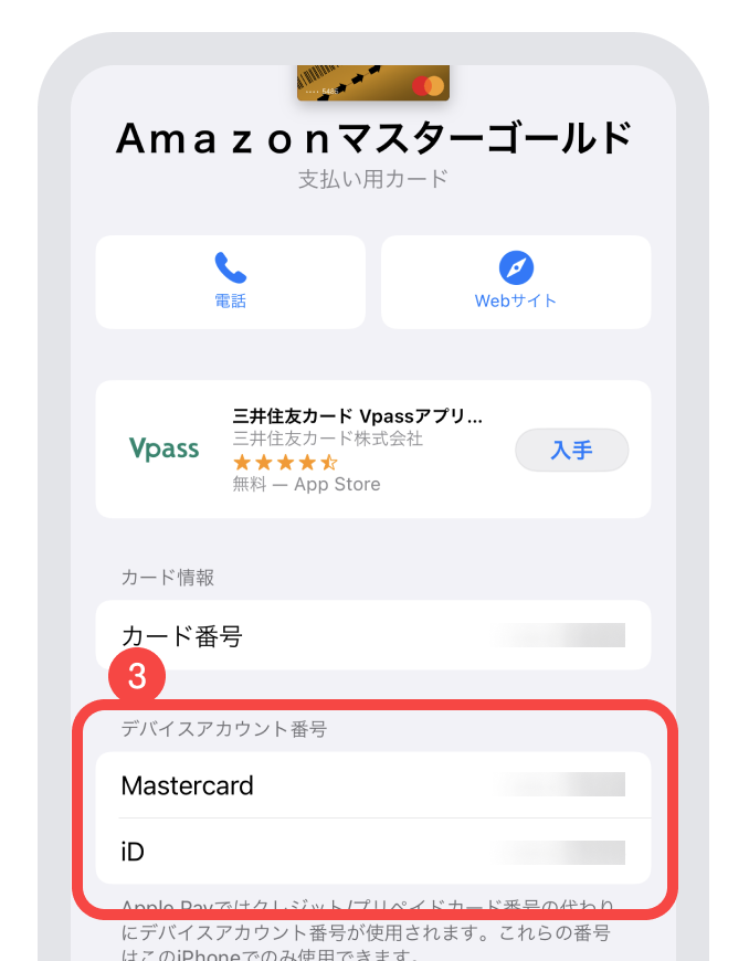 - カードの詳細ページ中ほどにデバイスアカウント番号が記載されています