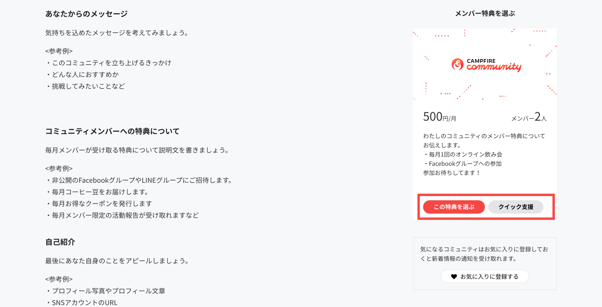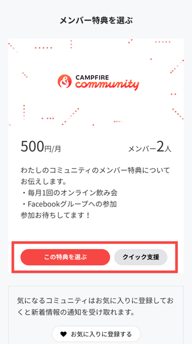 コミュニティページの[今すぐ参加する]ボタン、もしくは参加したいメンバー特典の[この特典を選ぶ]ボタンから参加することができます。
