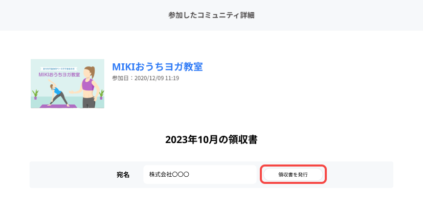 5. 宛名欄に発行したい宛名を入力し、[領収書を発行]を押すと、発行されます。ご設定後現在メンバー・退会済みメンバーが閲覧可能です。