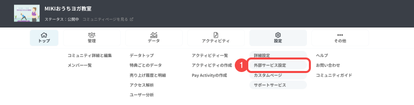- ダッシュボード上部のナビゲーションバーの「設定」の中にある[外部サービス設定]を選びます