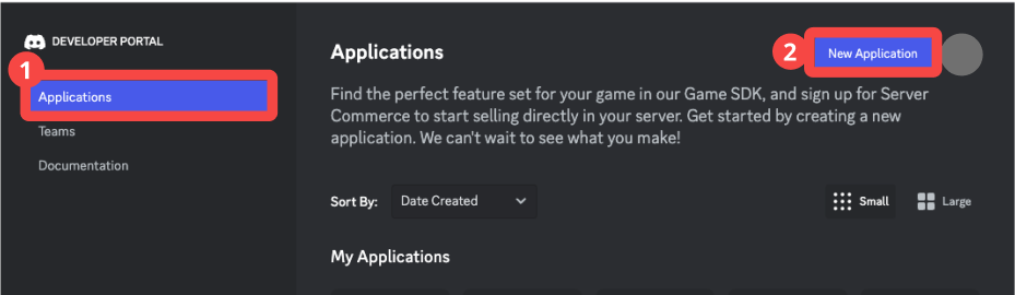 1. Discord Developer Portal (英語ページ)へご自身のDiscordアカウントでログインし、左サイドバーのApplicationsを開く