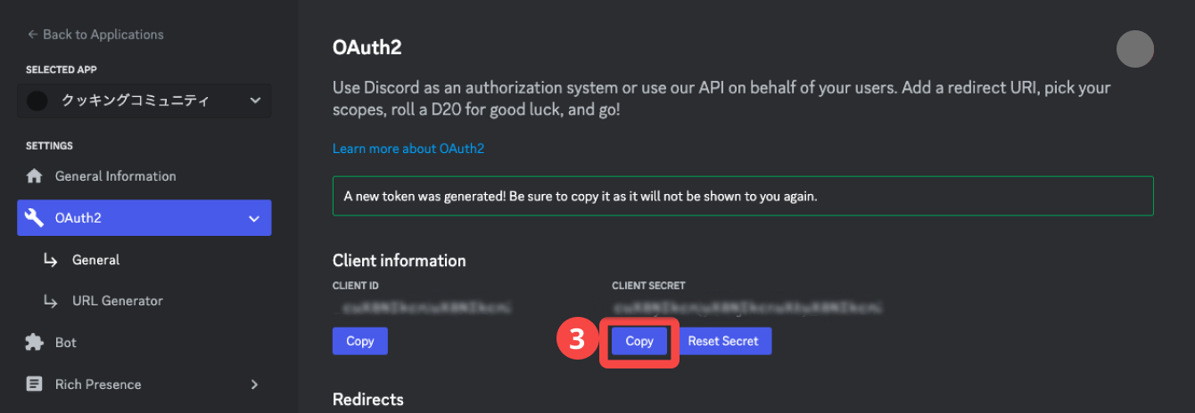 3. 発行されたCLIENT SECRETをコピー