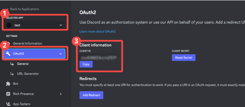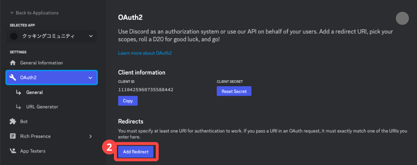 2. Discord Developer PortalのOAuth2のRedirectsエリアの[Add Redirect]を押す