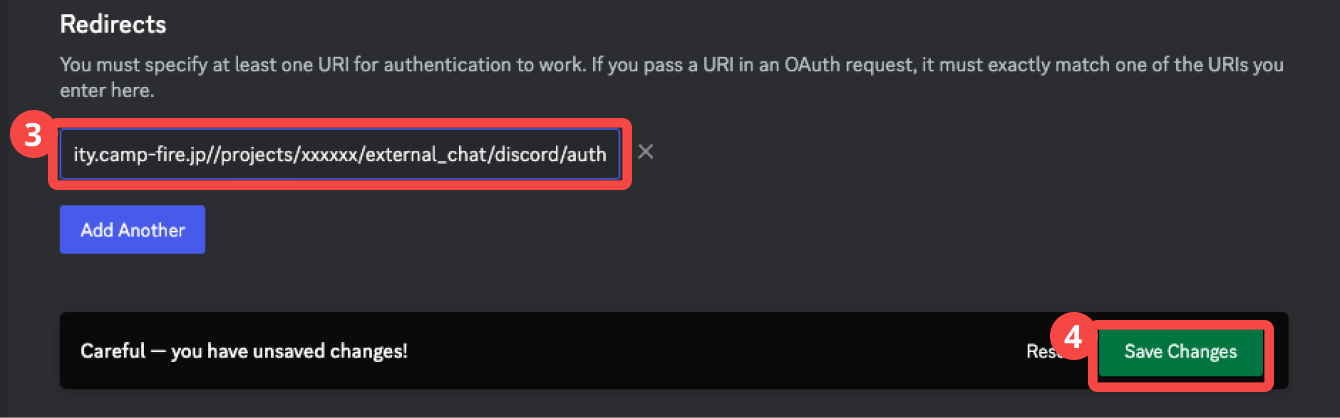 Discord連携設定ページのRedirects URLの[URLをコピーする]からコピーしたURLを貼り付けるか、