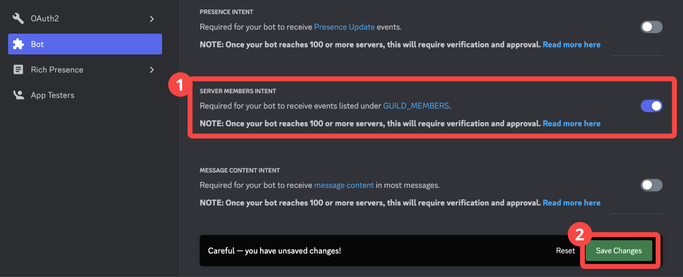 5. BotのSERVER MEMBERS INTENT設定をオンにする