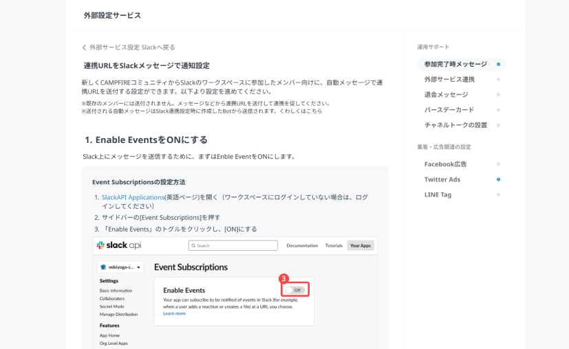 - ダッシュボードの外部サービス設定 >Slack連携ページの「連携URLをSlackメッセージで通知」の[設定する]を押す