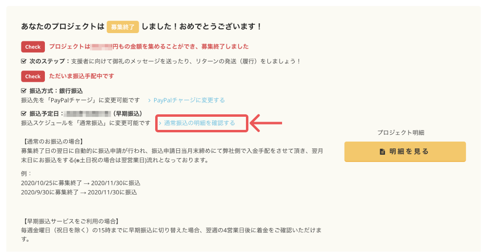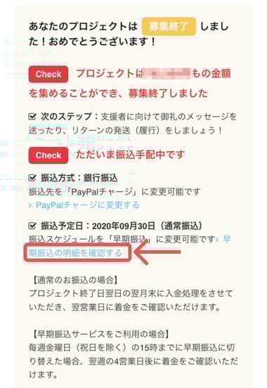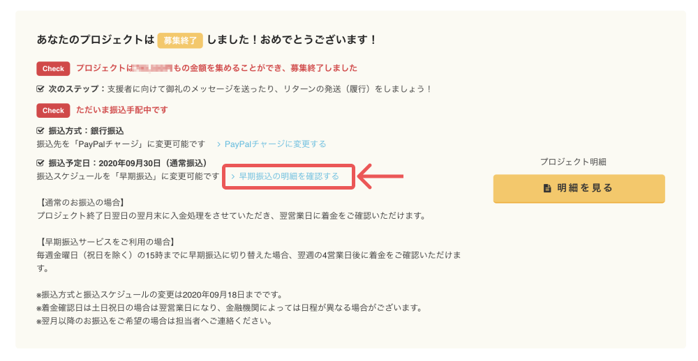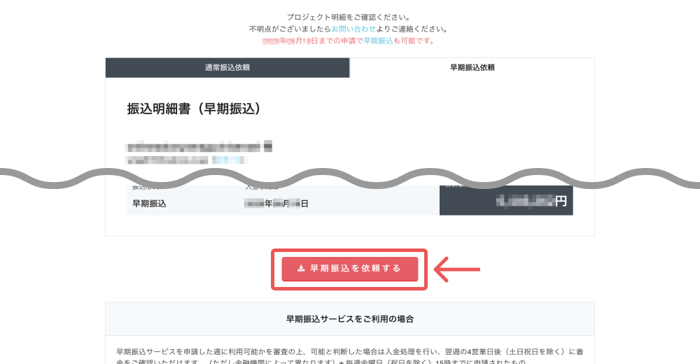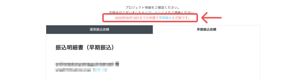 - プロジェクト管理画面内に表示される【早期振込の明細を確認する】をクリック。