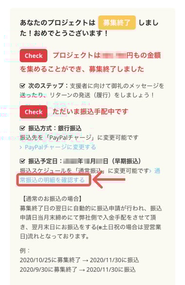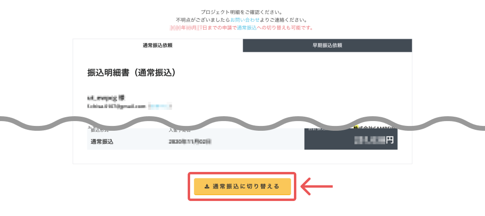 - プロジェクト管理画面内に表示される【通常振込の明細を確認する】をクリック。