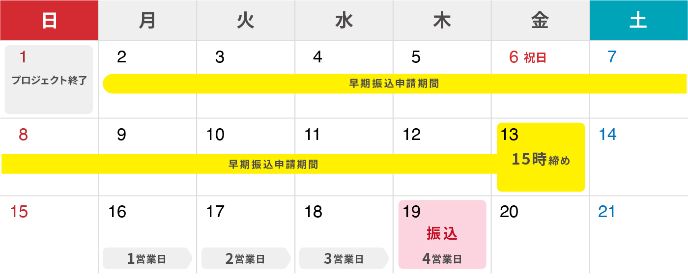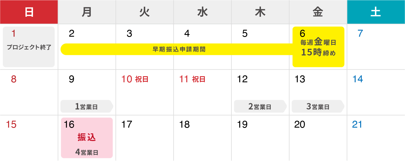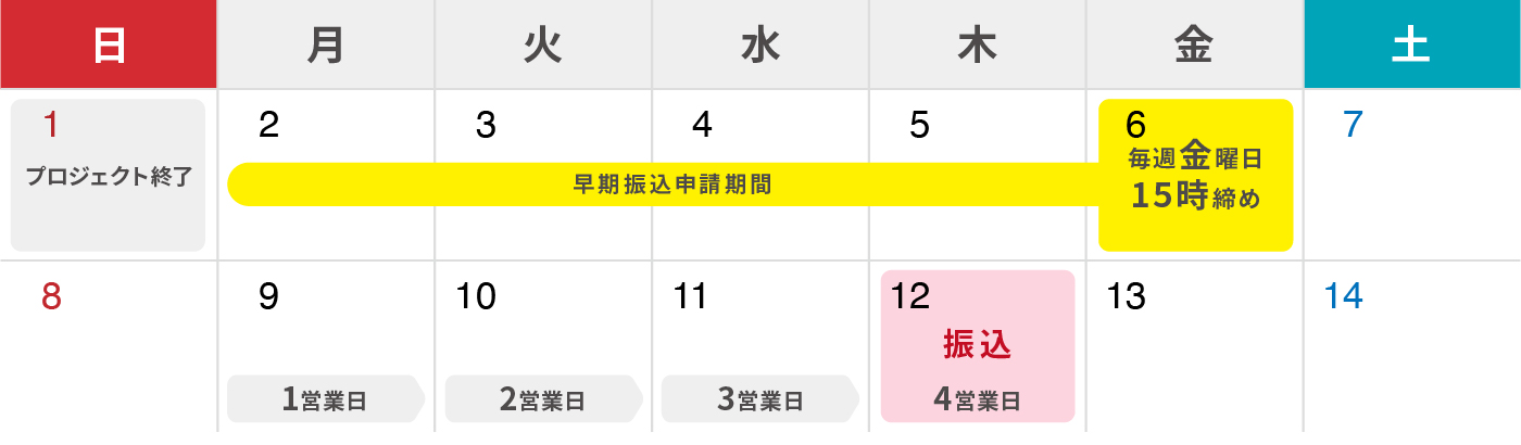 ※プロジェクト終了月の毎週金曜15時締めで、プロジェクト終了日の翌1時以降に早期振込依頼されたものを指します