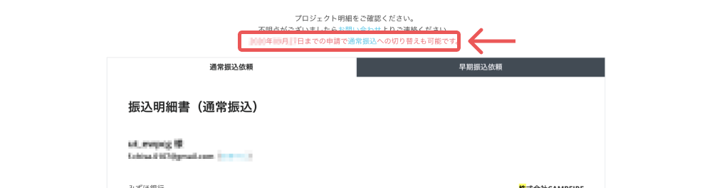 プロジェクト管理画面内にある【早期振込の明細を確認する】をクリックすると、明細の上に申請できる期限が表示されています。
