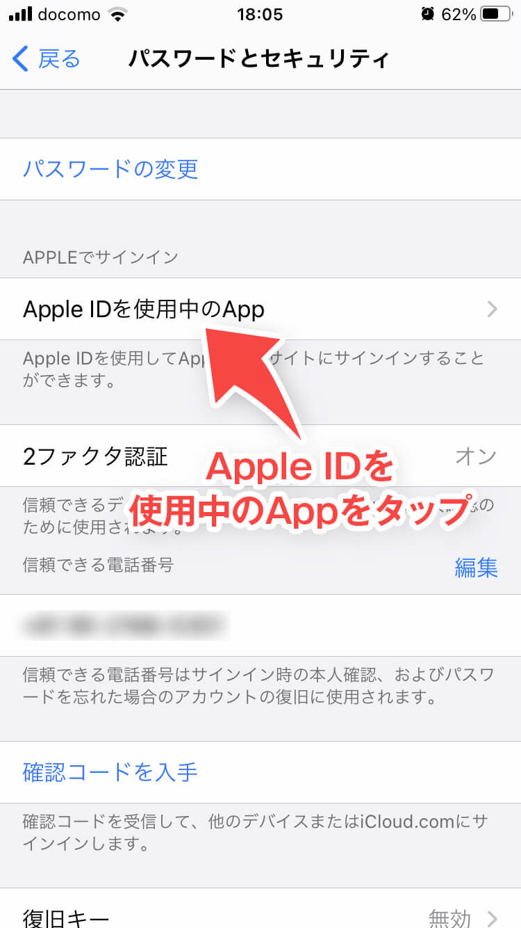 - 「Apple IDを使用中のApp」を押す
