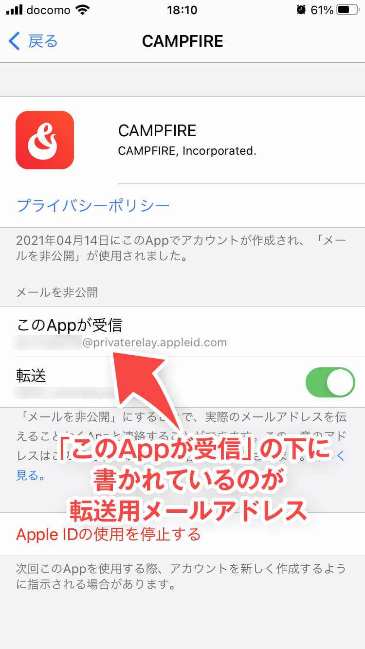 - 「このAppが受信」の下に書かれているメールアドレスが、転送用メールアドレスです。